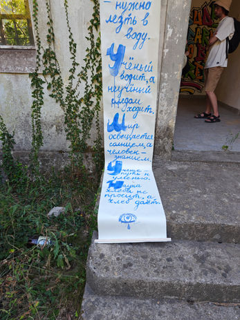 The site-specific installation was placed on an abandoned school building. Work consists of two paper canvases feature well-known Russian proverbs about the power of knowledge. Proverbs were written in blue ink - the standard color associated with school writing in Russia. By placing the text outside its original institutional and national context, the work reflects on how subjectivity is reconstructed through inherited linguistic frameworks. Learning is presented as a displaced structure.
